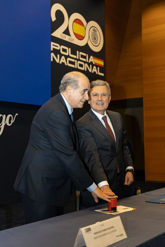 Autoridades presionando un sello sobre cartulina con logotipo bicentenario de la Policía Española.