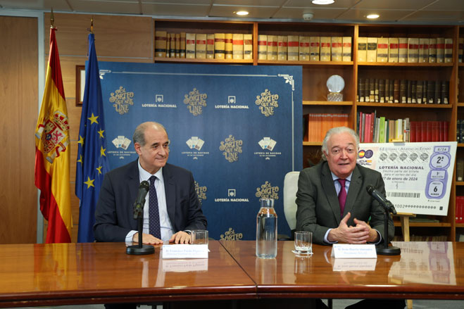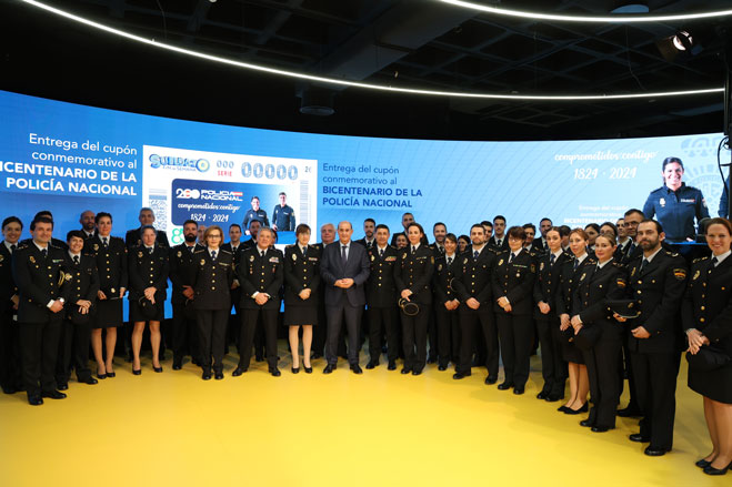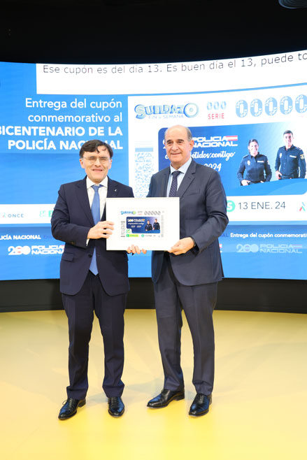 Autoridades sujetando, modelo del cupón conmemorativo del bicentenario de la Policía Española, en tamaño grande.
