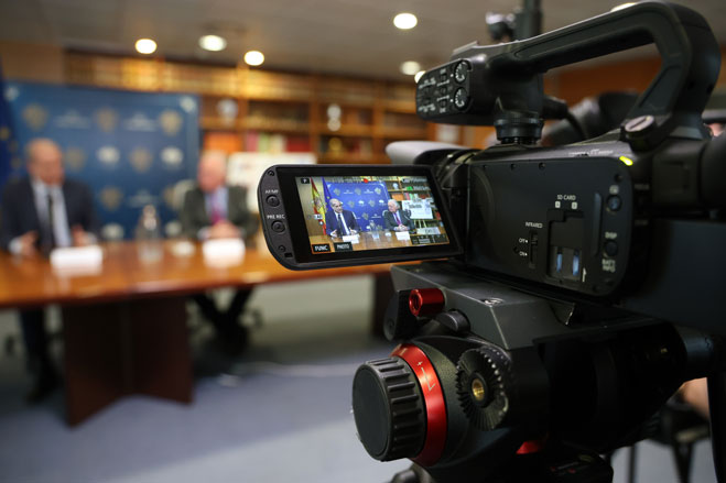 En primer plano cámara grabando el acto, al fondo difuminados las dos autoridades que están haciendo la presentación.