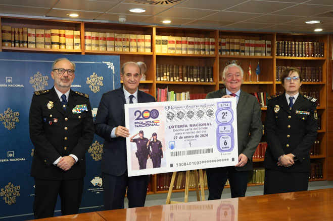 Autoridades civiles y policiales mostrando el décimo conmemorativo en tamaño grande.