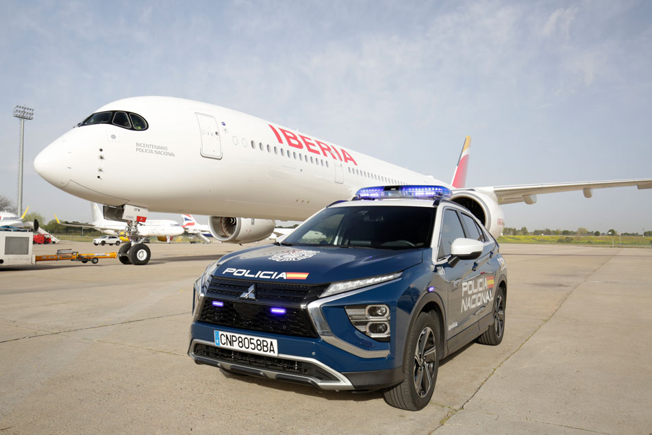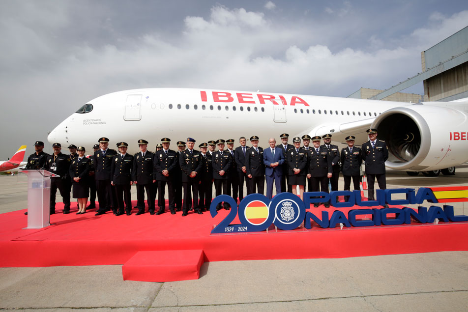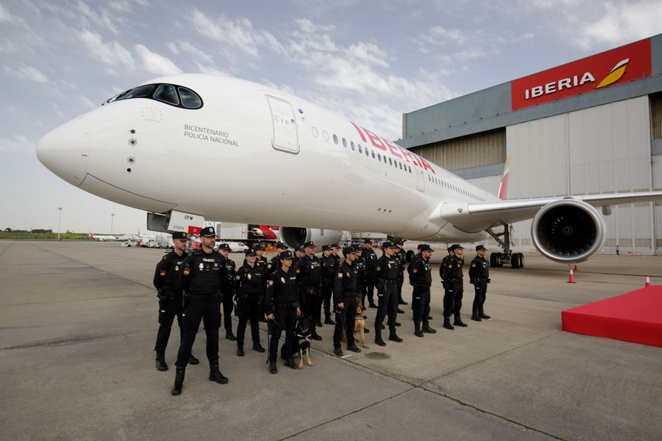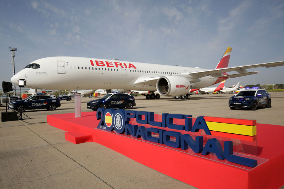 Avión de Iberia junto a rótulo conmemorativo del bicentenario de la Policía Española y vehículos policiales.