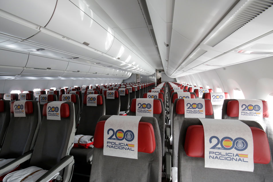 Interior del avión con el rótulo del bicentenario sobre los reposa cabezas.