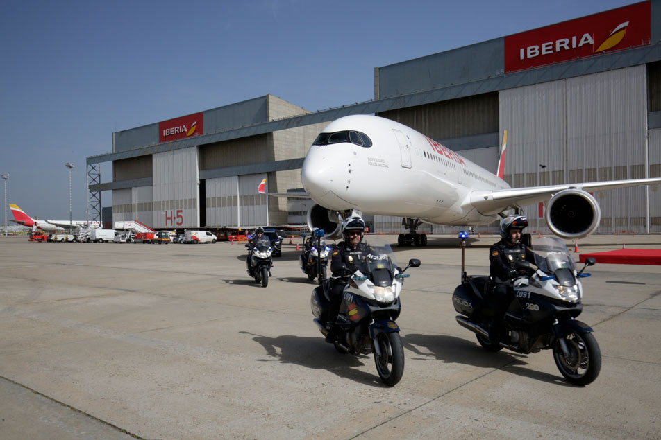 Avión escoltado por policías, de la unidad móvil, cerca del hangar de Iberia.