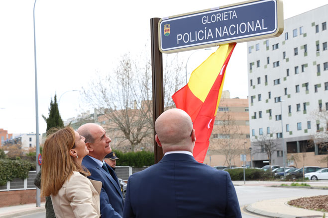 Autoridades mirando rótulo con el nombre Glorieta Policía Nacional.