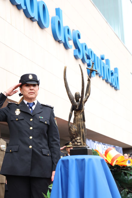 Agente femenina de la Policía Nacional haciendo el saludo reglamentario junto a la imagen del Ángel Custodio.
