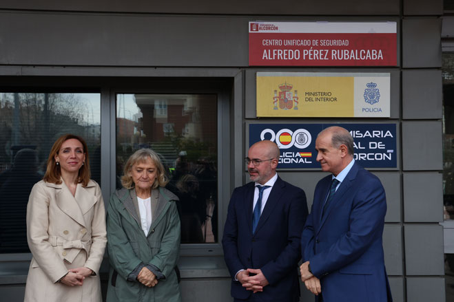 Autoridades posando delante de los rótulos del edificio que alberga la comisaría de Alcorcón.