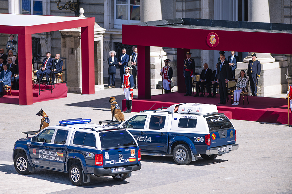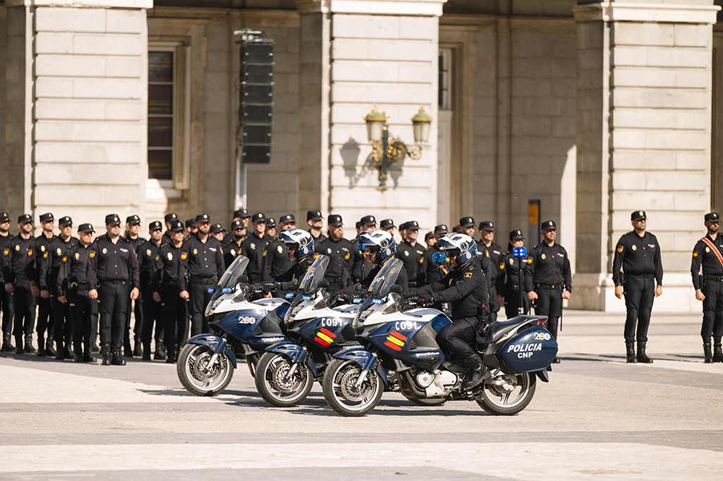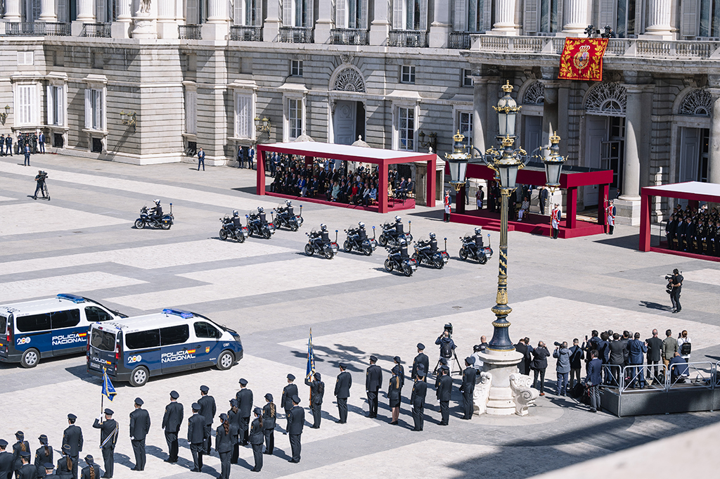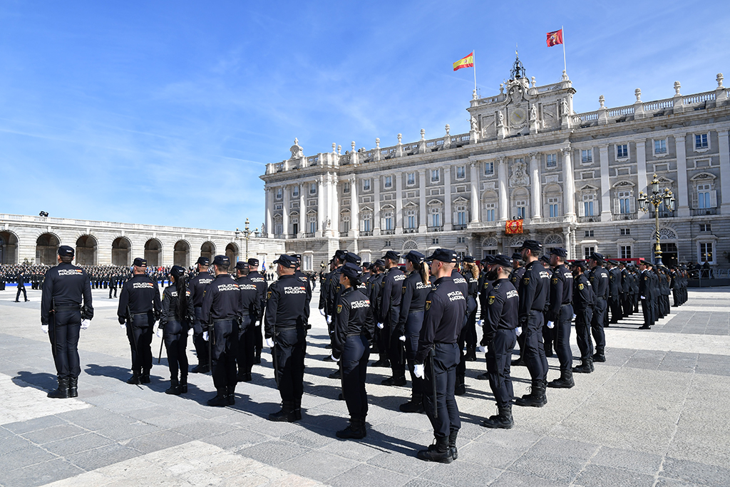 Agentes de la Policía Nacional en posición de firmes con el Palacio Real al fondo.