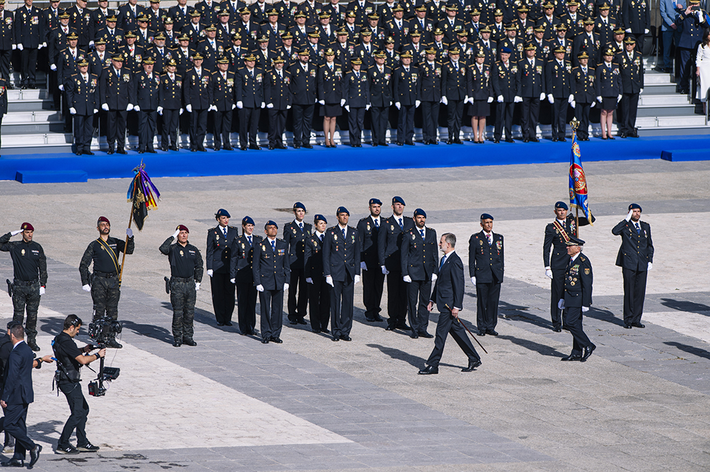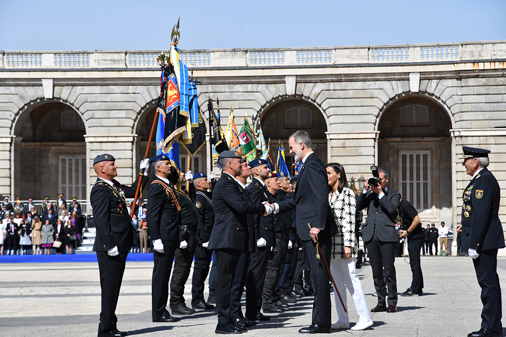SS.MM los reyes saludando a policías con los estandartes de diferentes unidades.