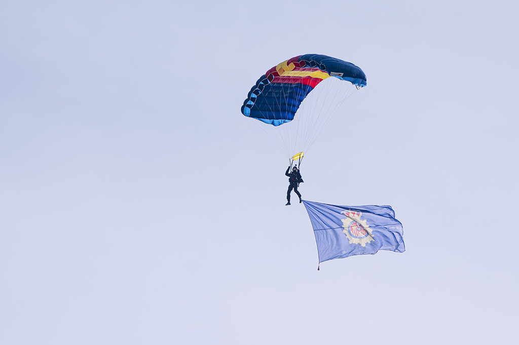 Paracaidista portando la Bandera de la Policía Nacional.