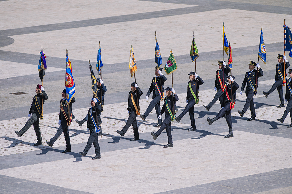 Policías Nacionales desfilando portando diferentes estandartes.