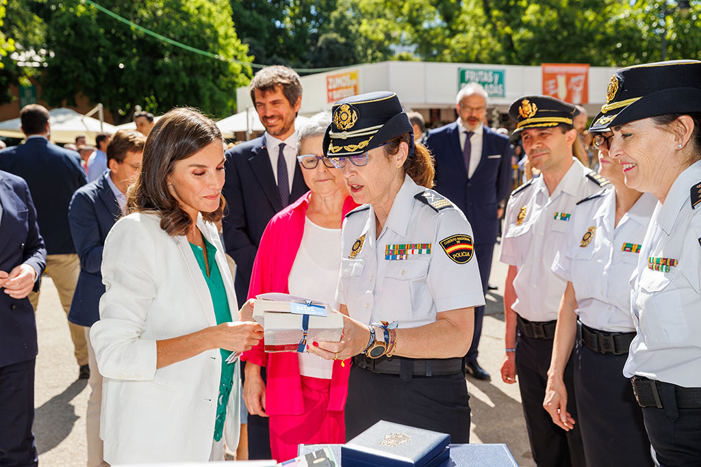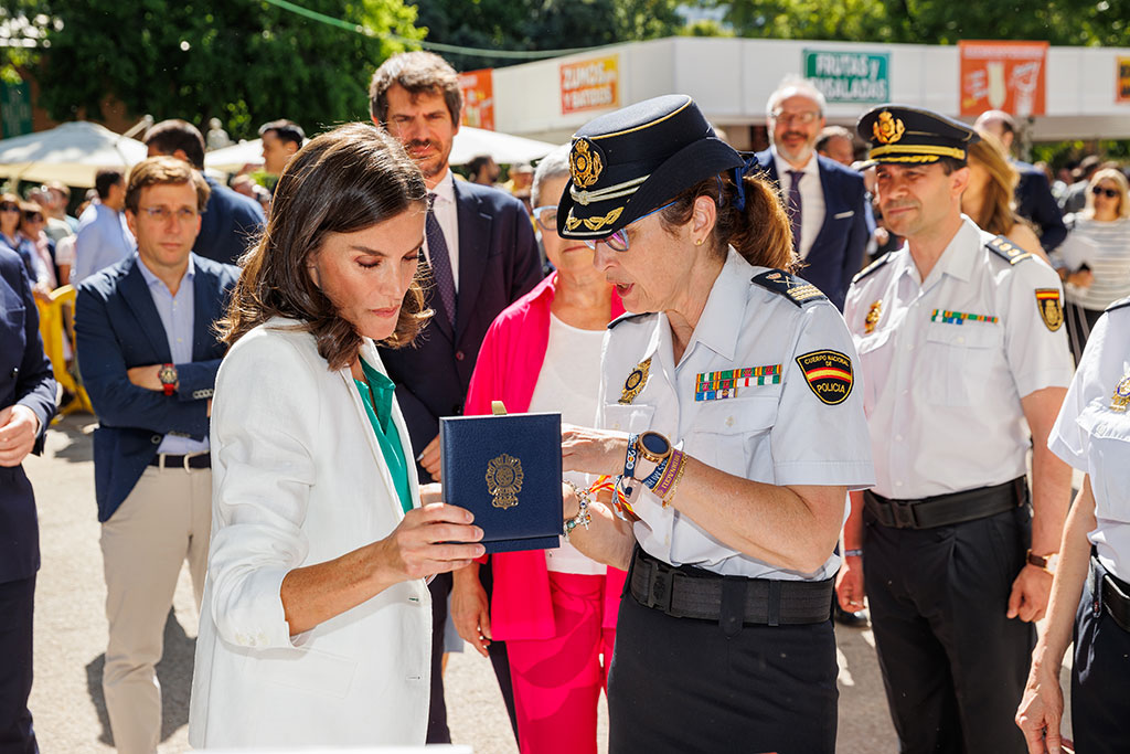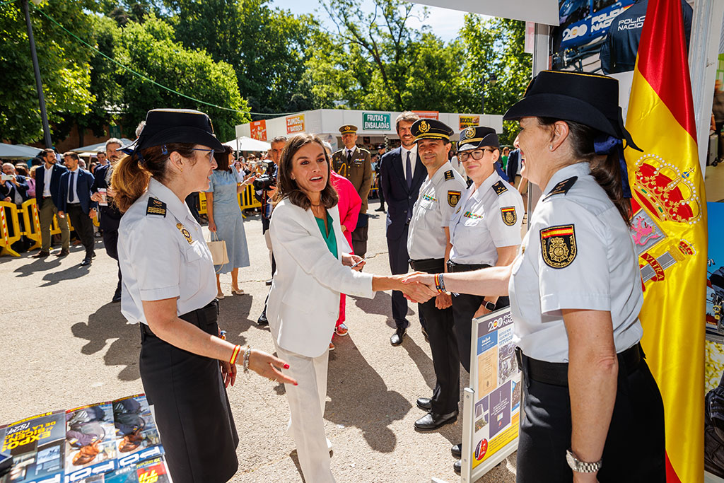 S.M. la Reina de España saludando a diversas autoridades policiales en el stand de la Policía Nacional.