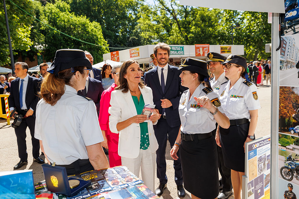 S.M. la Reina de España conversando con diversas autoridades policiales en el stand de la Policía Nacional.