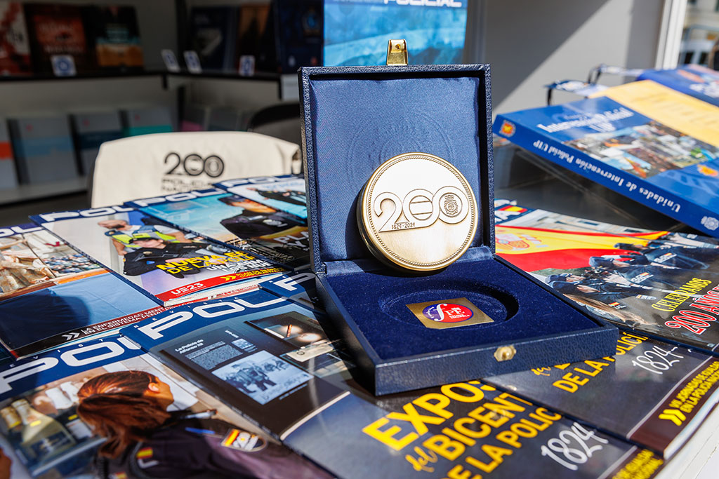 Primer plano de la moneda conmemorativa del Bicentenario en el stand de la Policía Nacional.