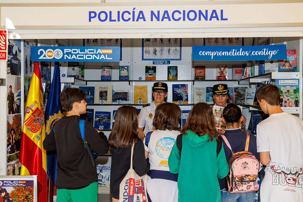 Varios niños observando el stand de la Policía Nacional en la Feria del Libro.