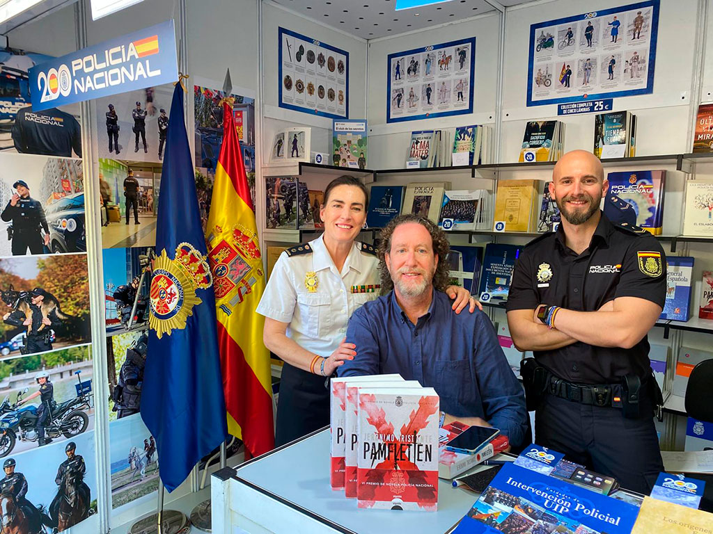 El escritor Jerónimo Tristante junto a dos funcionarios de policía en el stand de la Policía Nacional.