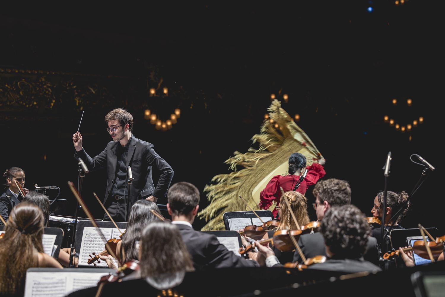 Primer plano de la orquesta y bailarina al fondo.