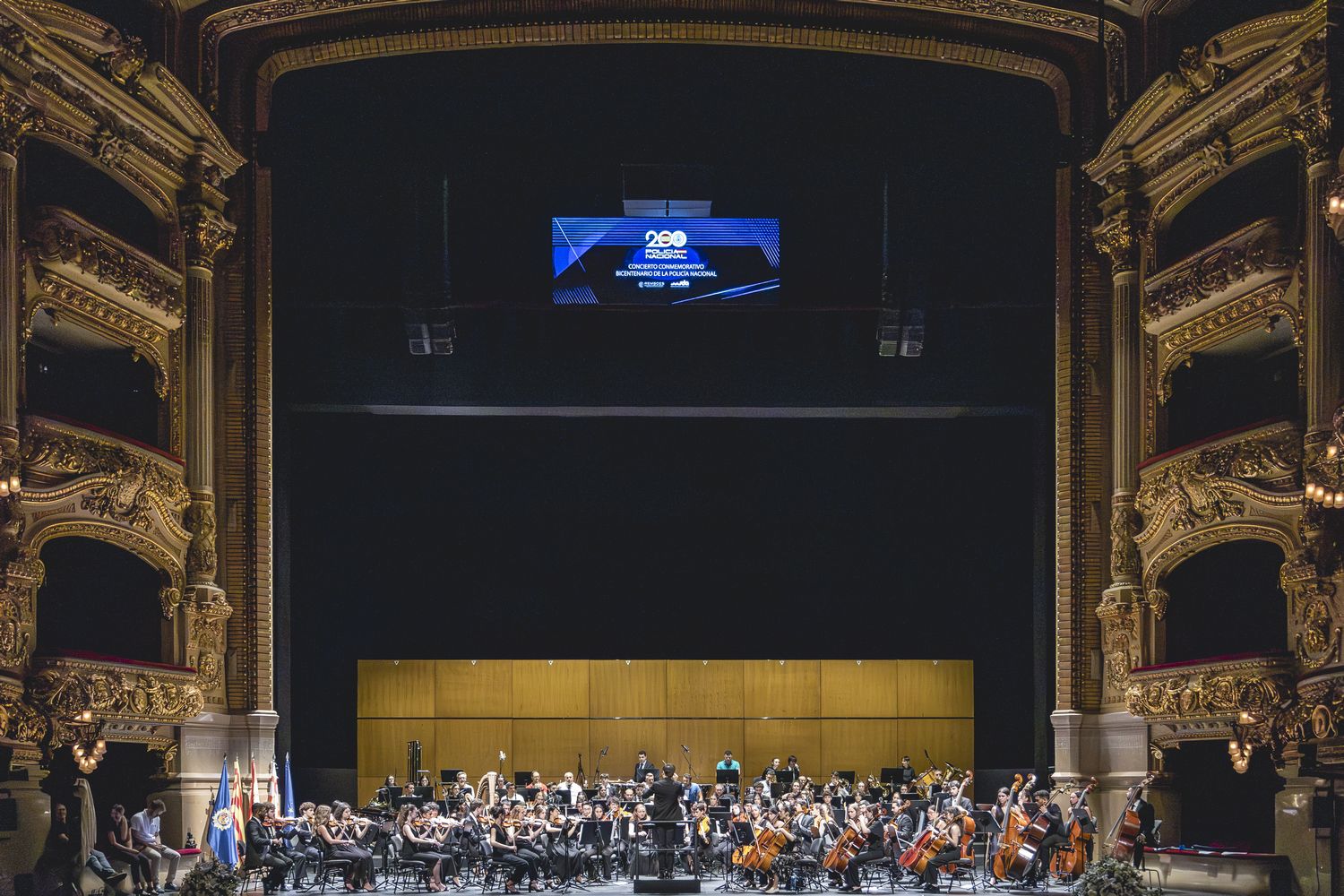Imagen de la orquesta en el escenario. En la parte superior, pantalla con el logo bicentenario