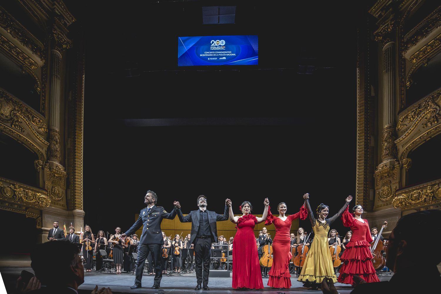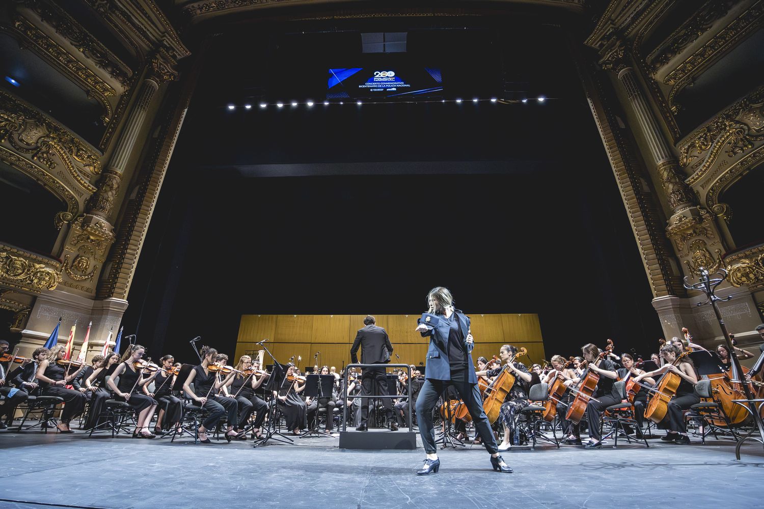 Bailarina en primer plano, con chaqueta policial y la orquesta al fondo del escenario