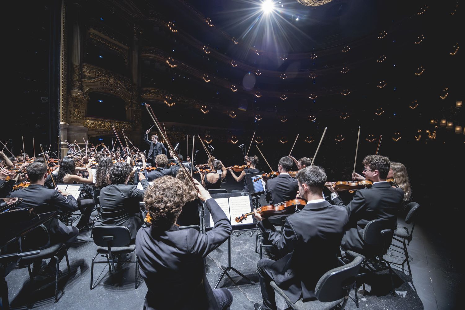 Vista desde atrás de la orquesta. Violinistas