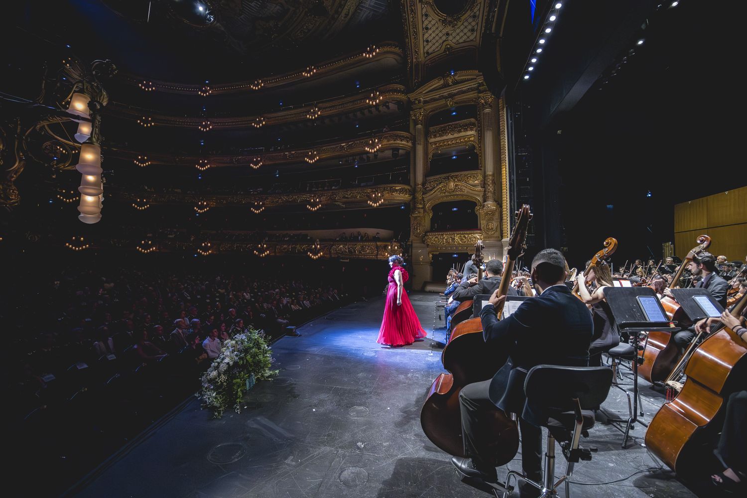 Vista lateral de la orquesta y de la bailarina en el escenario