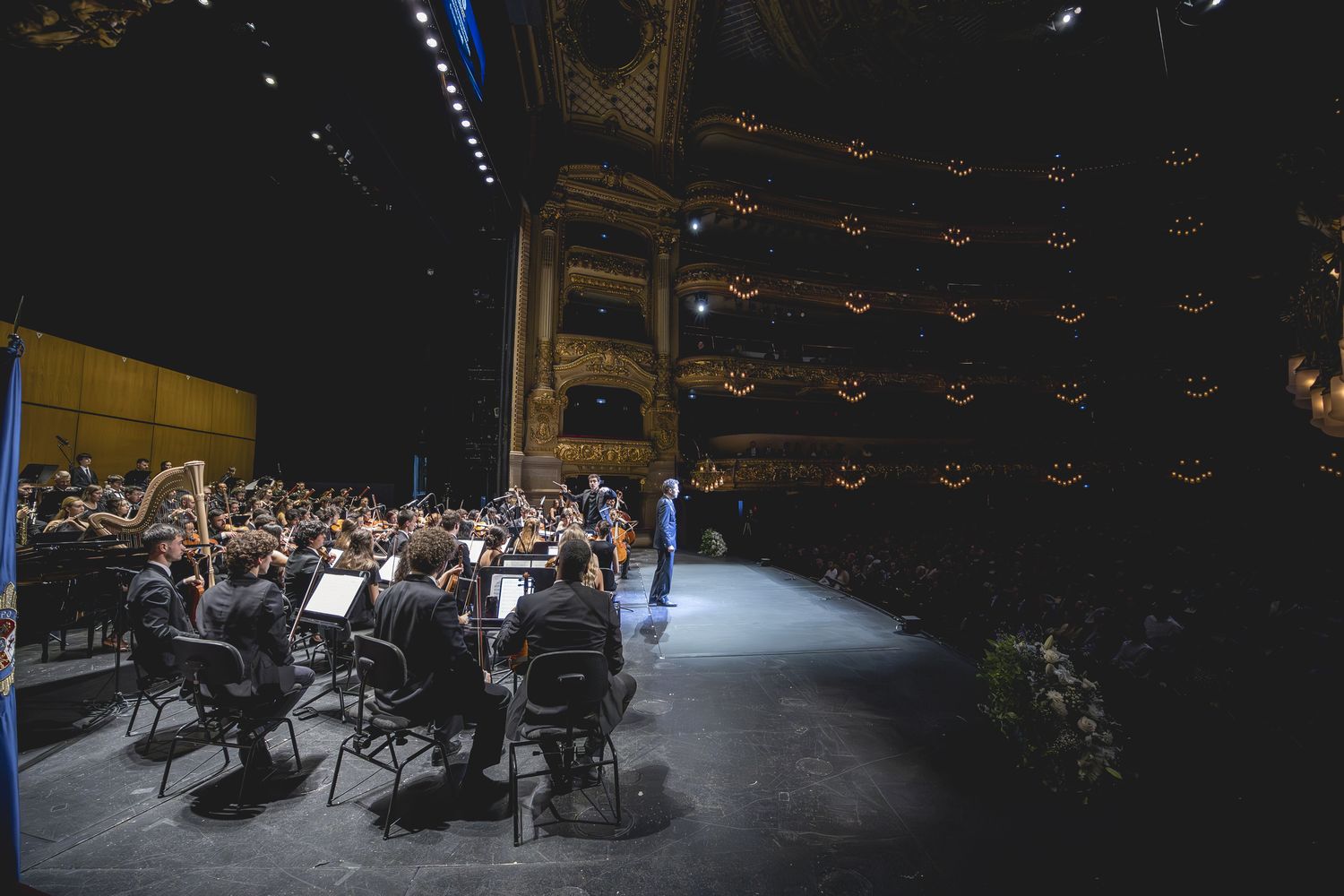 Vista lateral de la orquesta y solista en el escenario