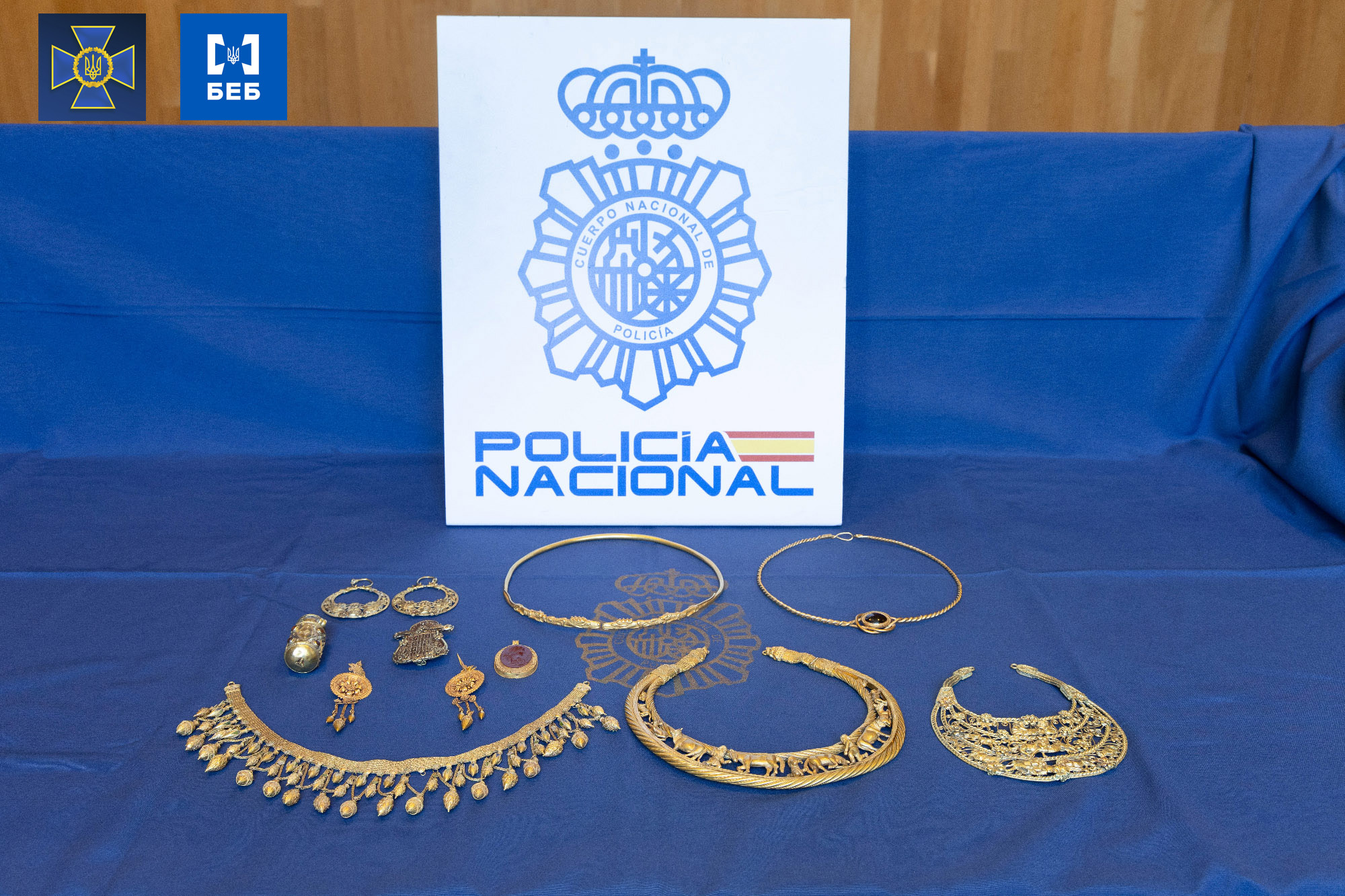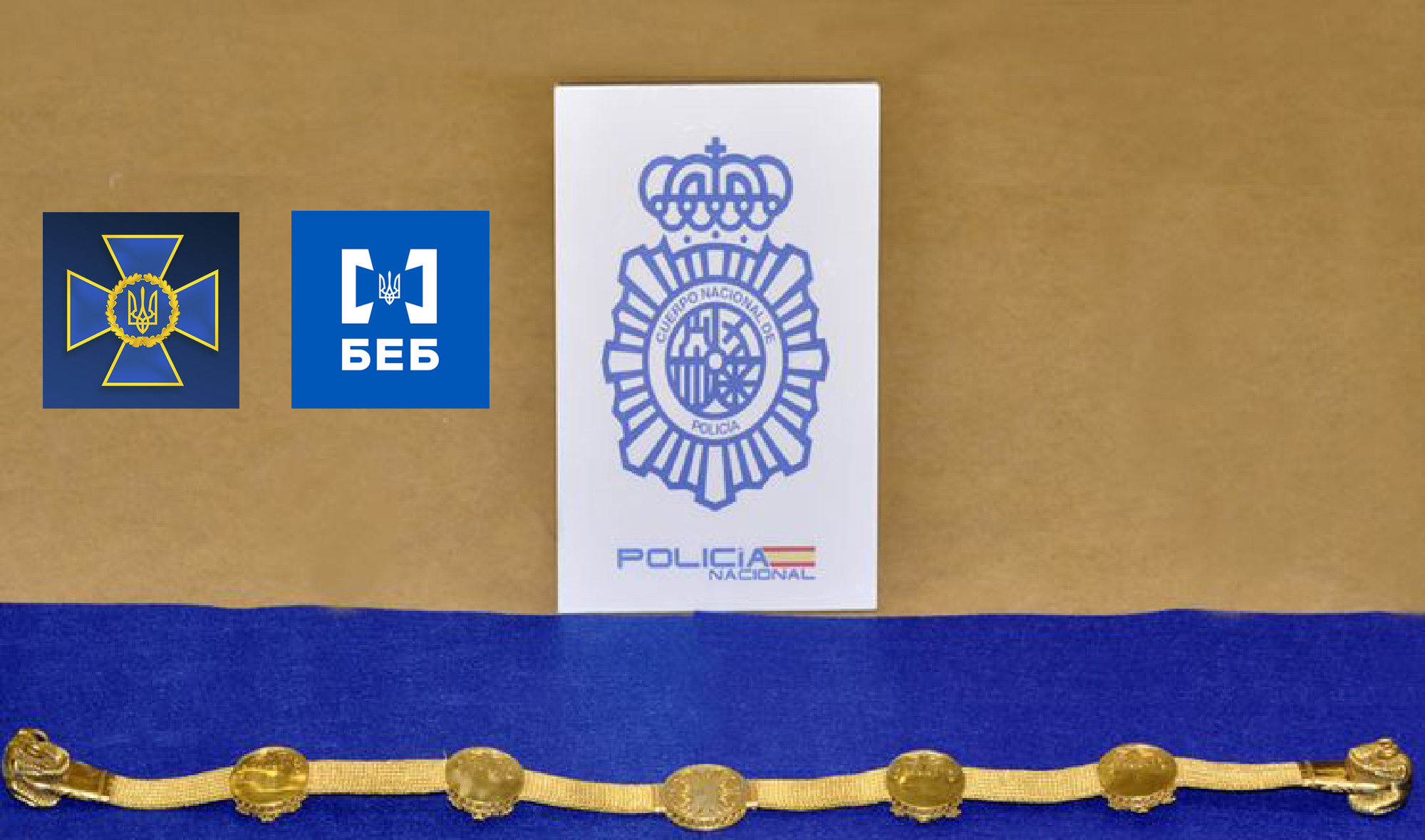 Agentes de la Policía Nacional, en una operación conjunta con el Servicio de Seguridad de Ucrania, han intervenido en Madrid 11 piezas de oro valoradas en más de 60 millones de euros pertenecientes al patrimonio histórico de Ucrania. Los agentes han arrestado a cinco personas (tres de nacionalidad española y dos de nacionalidad ucraniana), desarticulando con ello una red criminal dedicada al tráfico ilícito de bienes culturales procedentes de Ucrania. Las piezas intervenidas -joyas de oro de gran valor histórico y económico- habían sido sustraídas y exportadas ilícitamente desde Ucrania e iban a ser vendidas en Madrid. La investigación ha contado con la colaboración de la Agregaduría de Interior en Bulgaria, Ucrania, Albania, Macedonia del Norte y Chipre así como de la División de Cooperación Internacional.