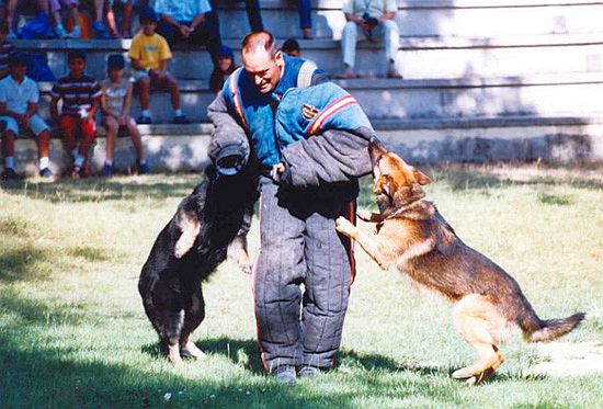 En una exhibición para niños, un policía con protecciones especiales, es mordido en los brazos por dos perros para su detención.