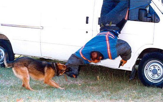 En una exhibición, un policía con protecciones especiales, es mordido en el brazo por un perro que lo saca de un vehículo por la ventanilla.