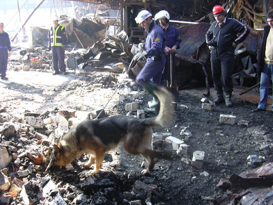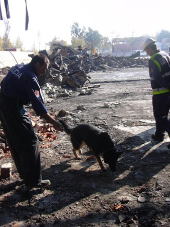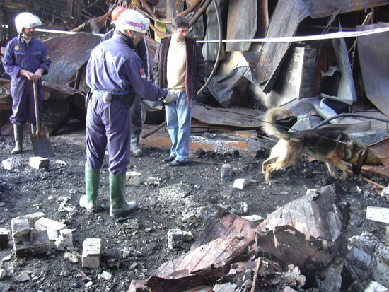 Un Policía Nacional de la Unidad de Guías Caninos rastrea el lugar donde se ha producido un incendio con un perro en busca de pruebas con otro agente.
