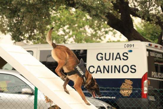 Un perro de la Unidad de Guías Caninos baja una rampa de un circuito de agilidad. Al fondo se observa un vehículo de Guías Caninos.
