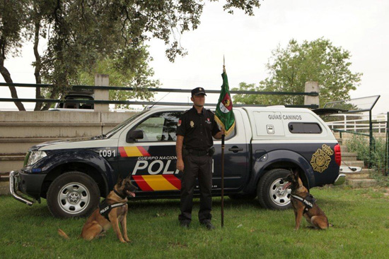 Un Policía Nacional de la Unidad de Guías Caninos posa junto con dos perros, un vehículo de la unidad, portando un banderín con el escudo de la misma.