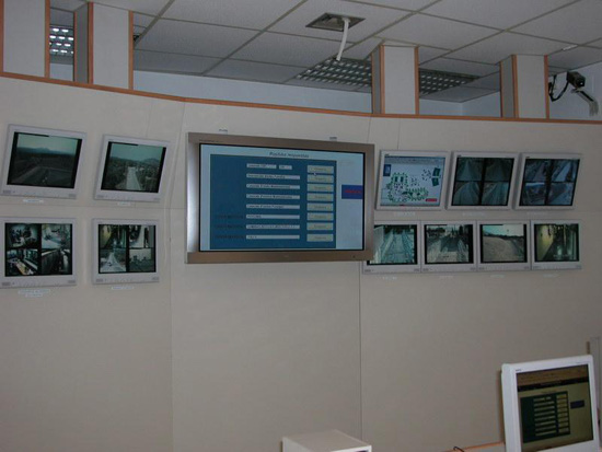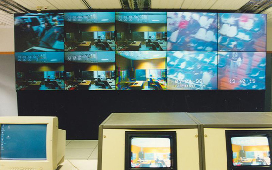 Sala en la que se observan las cámaras de seguridad de un edificio.