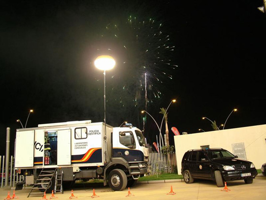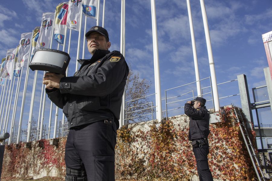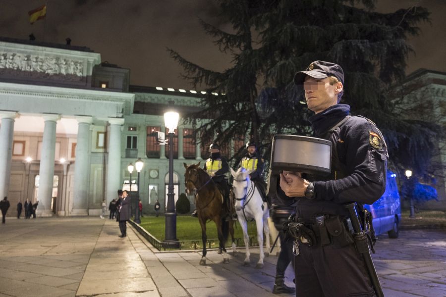 Policía Nacional manejando una antena para la detección de drones junto con la unidad de Caballería, dando protección en un edificio.