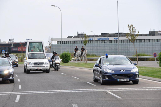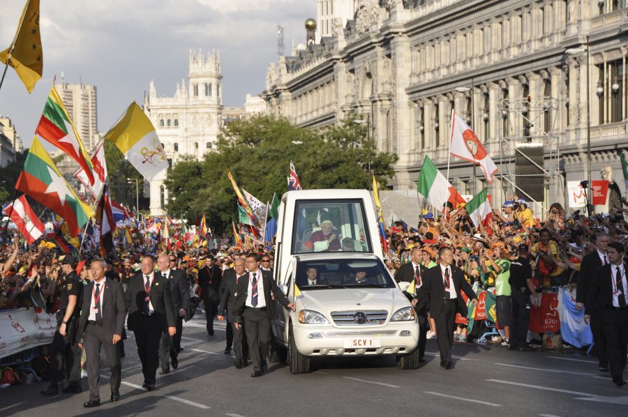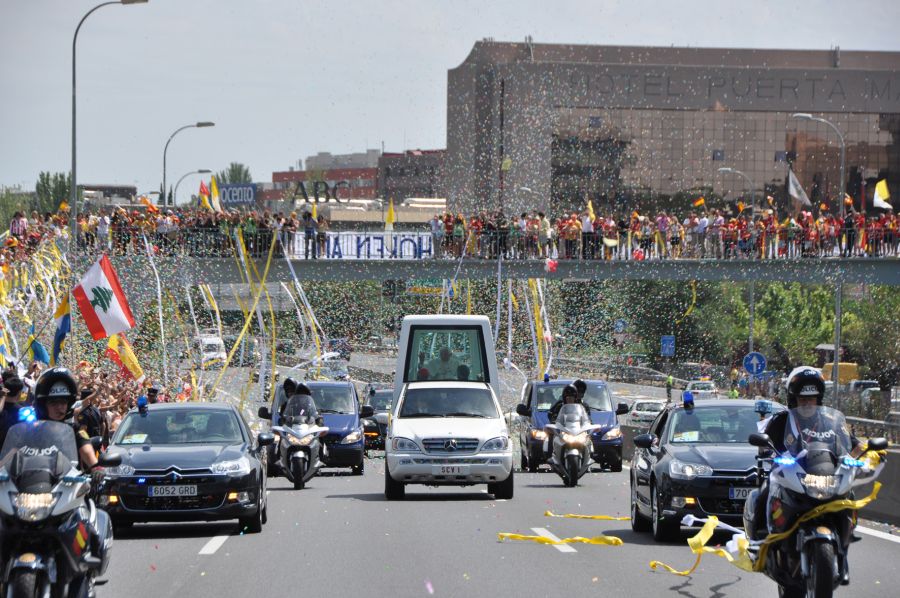 Escolta realizada al Papa Benedicto XVI el cual circula por las calles en su papamóvil aplaudido por un gran número de espectadores.