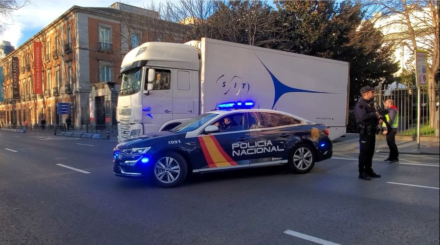 Una pareja de Policías Nacionales a caballo y un vehículo camuflado, prestando un servicio de escolta al Papa.