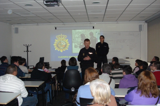 Un policía de la Unidad Central de Participación Ciudadana y Programas, dando una charla a padres y alumnos en un aula, junto con una policía.