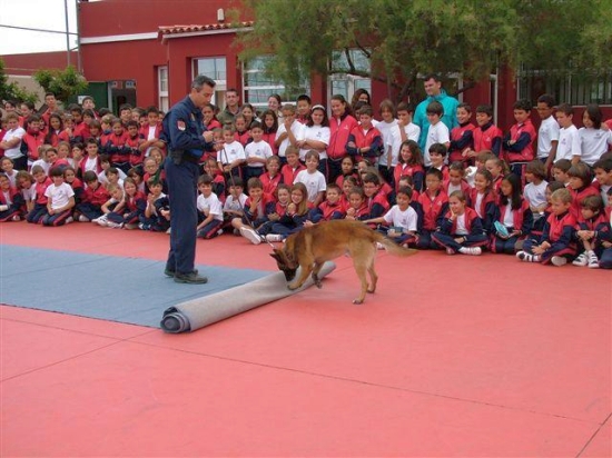 Exhibición a menores en un patio, un Policía Nacional de la Unidad de Guías Caninos con su respectivo perro, realizando un ejercicio de búsqueda.