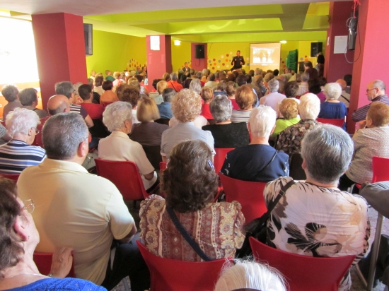 Un policía de la Unidad Central de Participación Ciudadana y Programas, dando una charla a personas mayores en un salón de actos.
