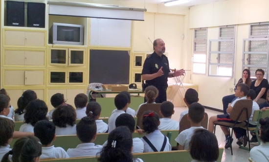 Un policía de la Unidad Central de Participación Ciudadana y Programas, dando una charla a alumnos menores y sus profesoras en un aula.