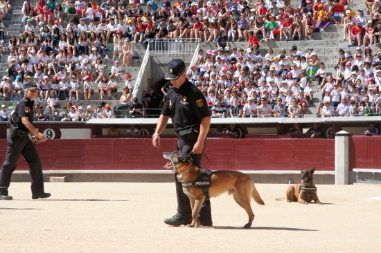 Exhibición a menores en una plaza de toros, dos policías Nacionales de la Unidad de Guías Caninos con sus respectivos perros, realizando ejercicios.