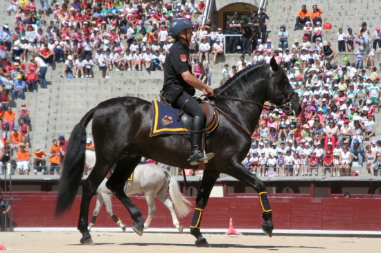 Exhibición a menores en una plaza de toros, dos Policías Nacionales de la Unidad de Caballería montados a caballo, realizando ejercicios.