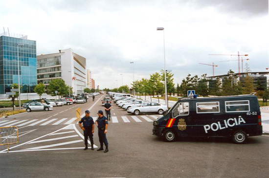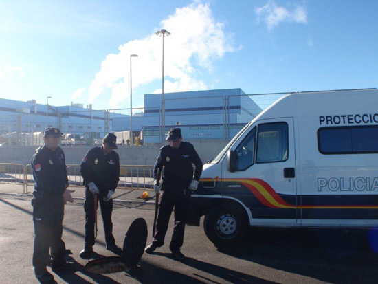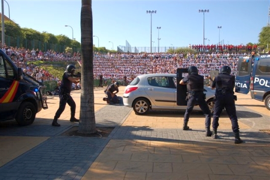 Exhibición ante una grada llena de menores, cuatro Policías Nacionales de Unidades Especiales detienen un vehículo y reducen a un sospechoso.