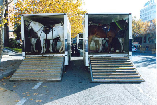Dos caballos de la Policía uno de color blanco y otro de color marrón en los remolques que utiliza la Unidad Especial de Caballería para su transporte