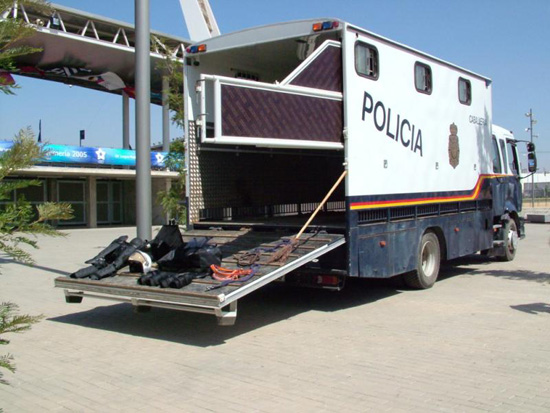 Camión de la Policía Nacional con su remolque en el que se muestra el equipo táctico que utiliza el Servicio Especial de Caballería.