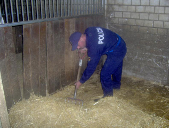 Cuidador de caballos limpiando una pezuña a un caballo de color marrón de la Policía Nacional