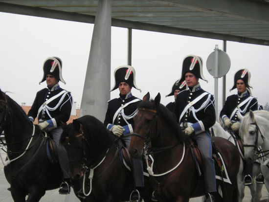 Policías Nacionales montados a caballos uniformados con el traje de gala de época.