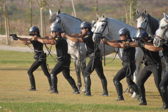 Policías Nacionales de la Unidad Especial de Caballería realizando prácticas de tiro en un descampado.