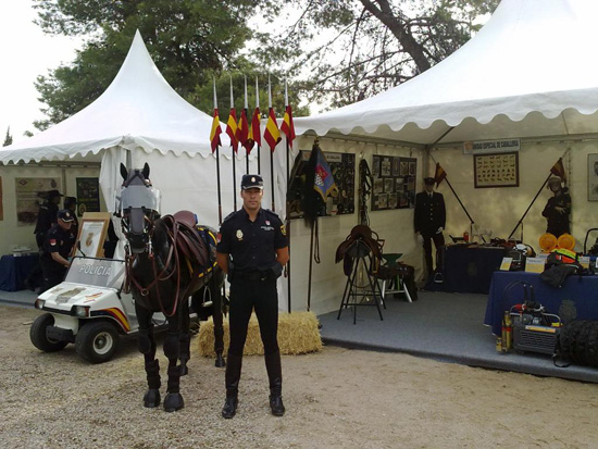Un policía nacional posa junto a una maqueta de un caballo y una caseta donde se exhibe diverso material de unidad especial de caballería.