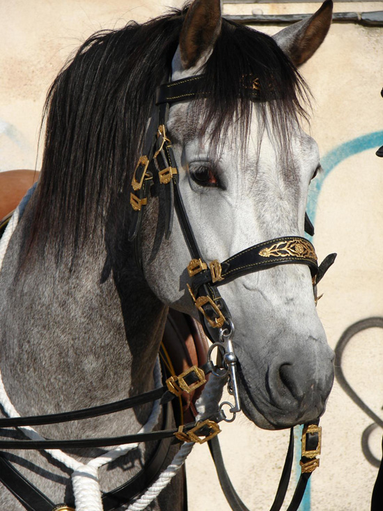Imagen de la cabeza de un caballo Tordo de la Policía Nacional, con un un arnés de color negro con adornos en color oro.
