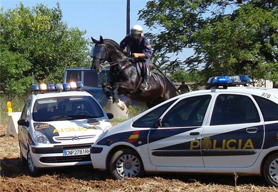 Un caballo de la Policía Nacional de color negro realiza un salto a dos vehículos tipo Zeta